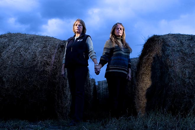 Genevieve Yetter picks up a tissue, dabs at her eyes. Eldon Yetter stares straight ahead.