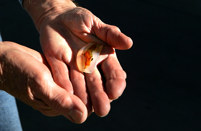 Even now, he sits out behind his home in the shade, a polishing wheel spinning in front of him, a piece of agate in his hands, water flying. He works for hours at a time as he takes something that is merely interesting and makes it sparkle and shine.