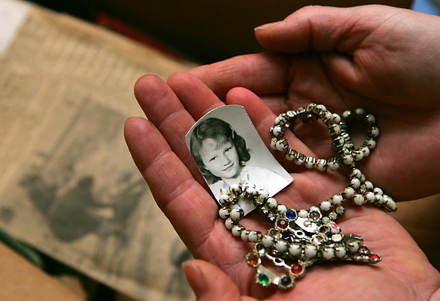The box holds a wrinkled brown sack with the broken remains of a necklace and a pewter pin Linda wore the morning she died.
