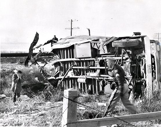 The impact hurled the front section of the bus into a barrel roll. The bus tore down the crossing sign as it tumbled to a stop on its side, landing 192 feet away. Its jumbled frame rails protruded next to a gaping hole where, an instant before, there had been children.