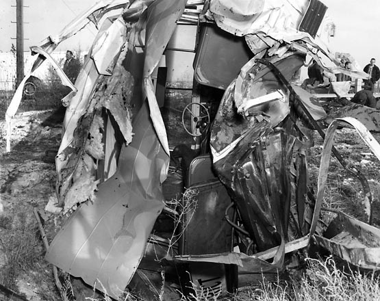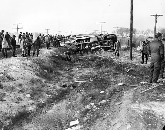The locomotive carried the crumpled remains of the rear end of the bus 455 feet, dumping them upright on the other side of the tracks, four twisted seats left in the shattered hulk. The rear axle and dual wheels, ripped free, landed nearby.